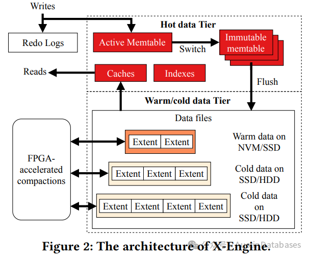 存储布局,上图显示了x-engine的架构,X-Engine 将每个表分成多个字表,并未每个字表维护一个LSM树,关联快照和索引,x-engine中的每个数据库中包含一个重做日志,每个LSM树由一个位于主存储器中的热数据层和一个位于NVM/SSD/HDD的数据处理层组层,热,温,冷不同的数据的层次在系统中存储在不同访问频率的层次中,热数据包含一个活动的内存表和多个不可变的内存表,他们是跳表,用于存储最近插入的记录,并缓冲热记录的缓存,这里不同访问频度的数据已树桩的结构组织数据,树的每个层级的存储有一个排序的extent序列来组织。extent 包含记录快以及关联的过滤器和索引。我们正在探索机器学习技术与数据访问拼读之间的关系。