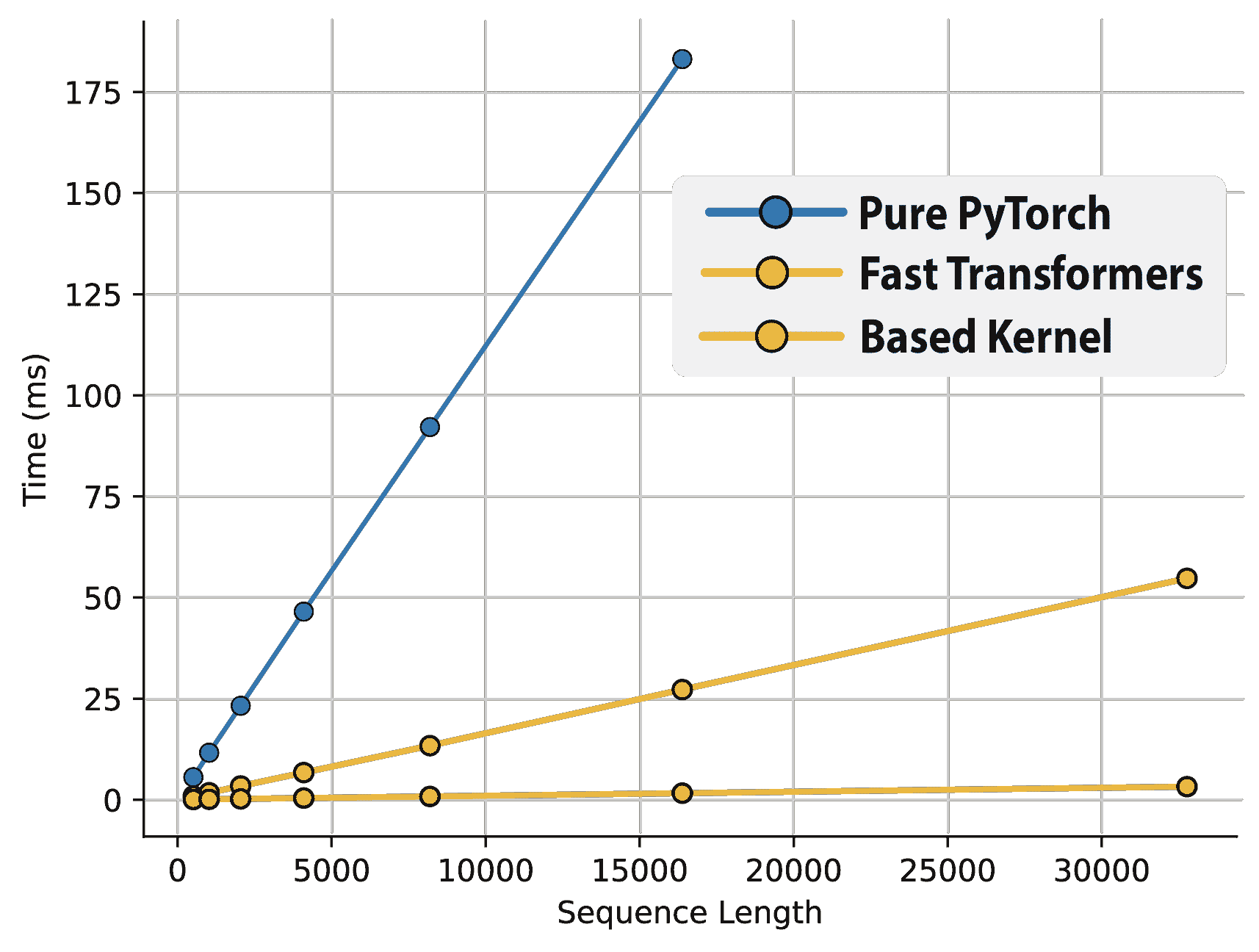 下面我们将比较朴素的 Taylor 注意力前向传递,一个利用来自Fast Transformers的流行线性注意力内核的实现,以及我们的自定义内核在批处理大小(序列长度 1024)上的表现。