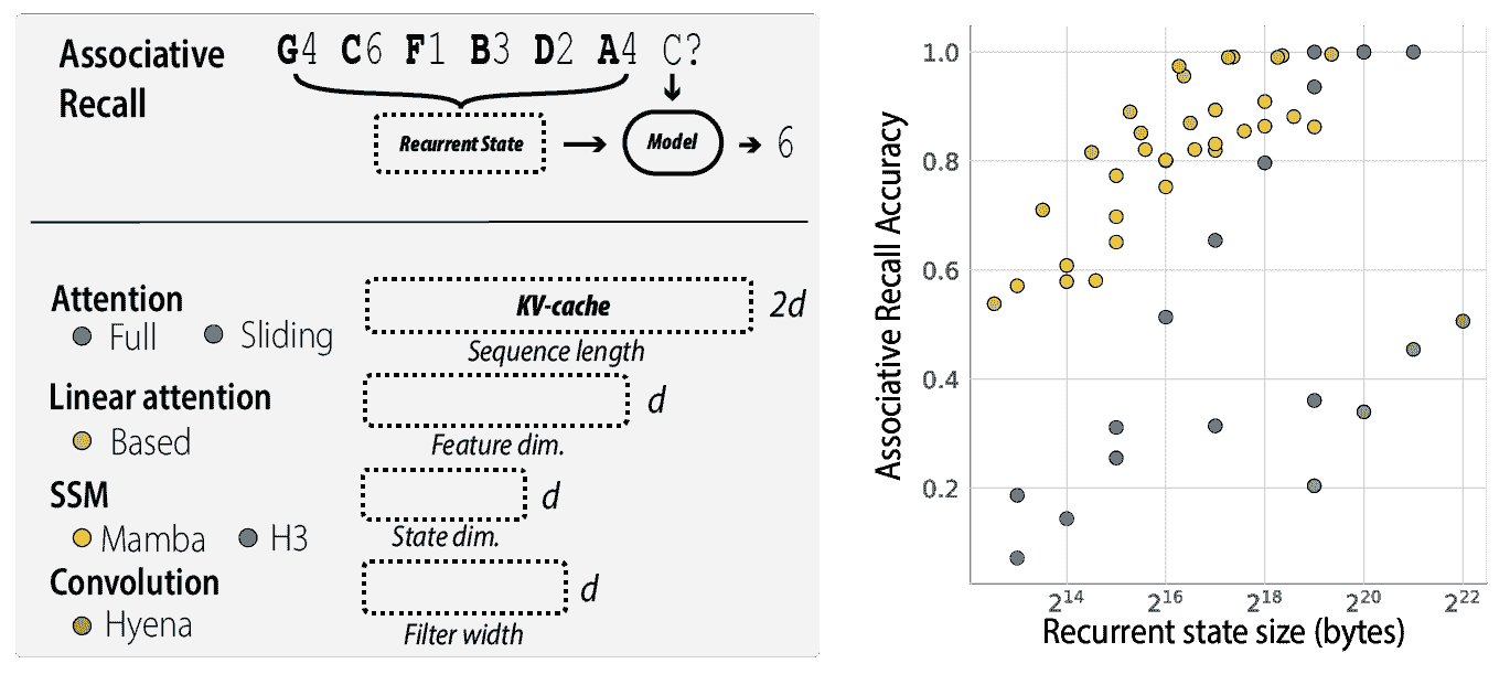 要开始回答这个问题,我们首先必须考虑什么会减慢架构的速度。高效的架构(例如 Mamba)在推理时比 Transformer 快得多(例如吞吐量高 5 倍),这在很大程度上是因为它们具有较小的内存占用。较小的内存占用意味着更大的批处理大小和更少的 I/O。然而,直观地减少内存占用太多可能会损害模型回忆先前序列中看到的信息的能力。这对我们来说看起来像是一个经典的“没有免费午餐”情况,因此我们采取了一些流行架构,变化了影响内存占用的超参数,并在具有挑战性的合成联想召回任务上评估性能。