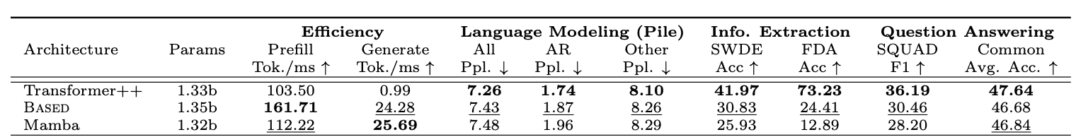 尽管它很简单,在真实的语言建模实验中(至少达到 13 亿参数),Based 在整体 Pile 困惑度和来自LM eval harness的标准零-shot 基准方面与 Mamba 竞争力相当(显示在问答-常见中)。