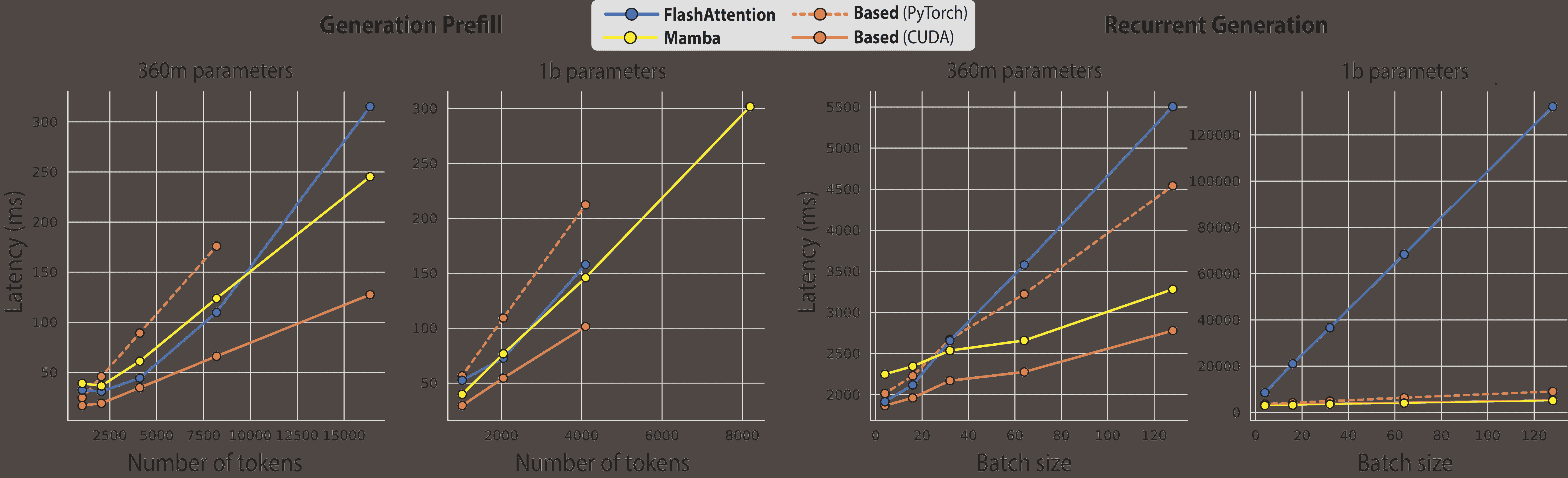 我们最近的工作深入探讨了召回挑战。我们首先阐明了模型的召回能力与其在生成过程中的内存消耗之间的基本权衡。这一分析为 Based 的设计提供了指导,Based 是一个简单的循环架构,在真实世界的召回密集任务(信息提取、阅读理解)和上下文学习方面优于先前的次二次模型。同时,Based 提供快速的生成速度:与 FlashAttention-2 和 Mamba 相比,Based 在处理提示时分别快 56%和 44%。Based 的文本生成吞吐量比 FlashAttention-2 高 24 倍。