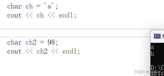 像下面给的是整形98,但类型是char,它要查ASCII码,对应的就是b: