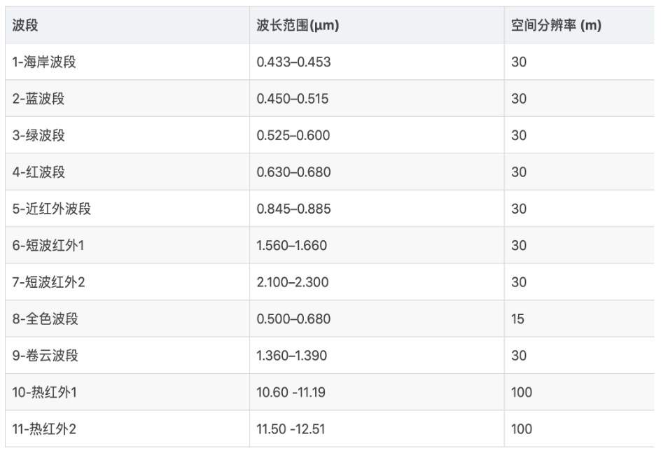 以2013年2月11日发射的Landsat系列最新卫星Landsat8为例,Landsat8对于各个光谱的波长信息: