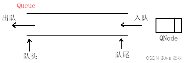 那么我们这时会选择结构更优得单链表,虽说单链表尾插得时间复杂度是O(N),但我们可以定义一个变量(QNode* ptail)来记录单链表的尾节点,这样每次入队时便不用再遍历单链表找尾节点,时间复杂度也降为O(1)。结构如下: