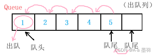0的位置,那么队尾就指向队列最后一个元素的后一个的下标,基于此结构,想要出队操作,时间复杂度就会升高为O(N)且十分不方便。因为每当要将下标为0的元素出队,后面的所有元素就要前移并改变队尾指向。大致如下: