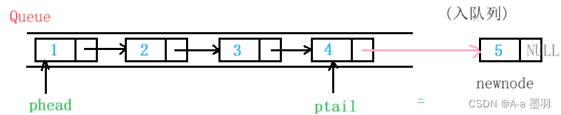 在链接时还要考虑到队列为空的情况,此情况下直接将头/尾指针指向新建的节点(pq->ptail = pq->phead = newnode)。