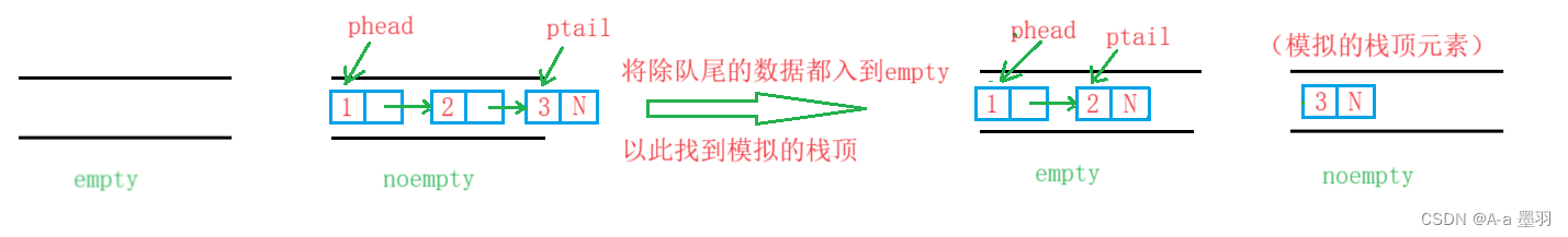 为了还原栈先入后出的性质,我们可以先找到不为空的队列(因为两个队列都有可能有数据,但不同时有),然后将有数据的队列(noempty)除队尾的一个节点全都出队列并入队列到无数据的队列(empty),这样一来就找到了尾节点(模拟的栈顶)。还需要注意的是,此时我们无需再将数据重新入到noempty。 逻辑大致如下: