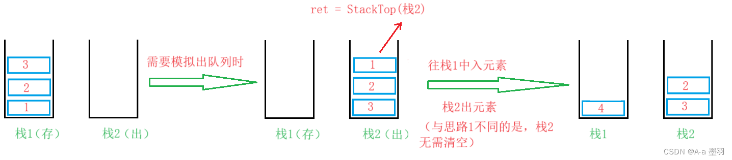 }obj->st1来存放数据,在模拟出队列时我们首先要断言栈1不为空,那么当栈1不为空且我们需要出队列头元素时。此时就需要栈2obj->st2来暂存数据,即我们将栈1除栈底的全部元素都出栈并入栈到栈2obj->st2,然后再出栈1最后的元素并返回,这样就模拟了先入先出性质。还需要注意的是在返回最后一个元素前还需要再将所有数据从栈2再入到栈1。逻辑如下:
