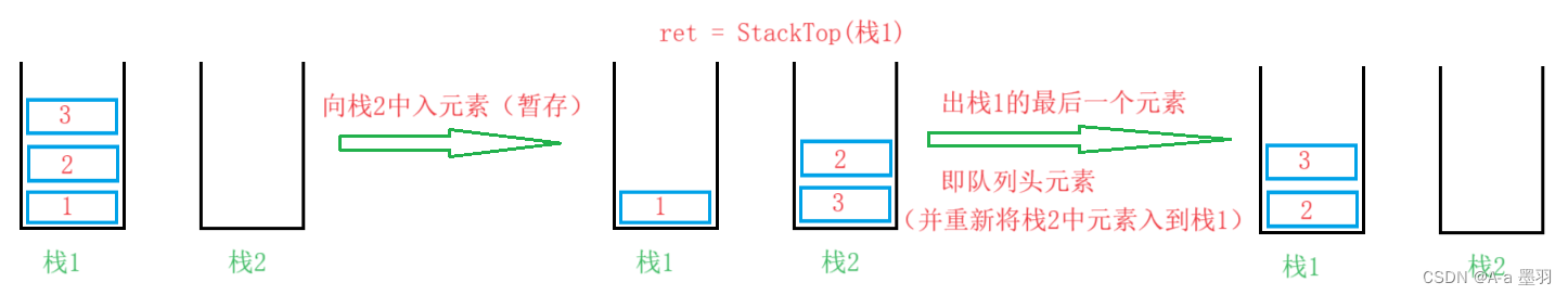 top就相当于队列头元素。每次从栈2中出元素时要先判断栈2中是否有元素,若没有,就将栈1中的元素出栈并入栈到栈2中。大致逻辑如下: