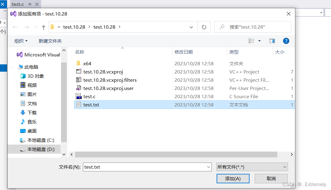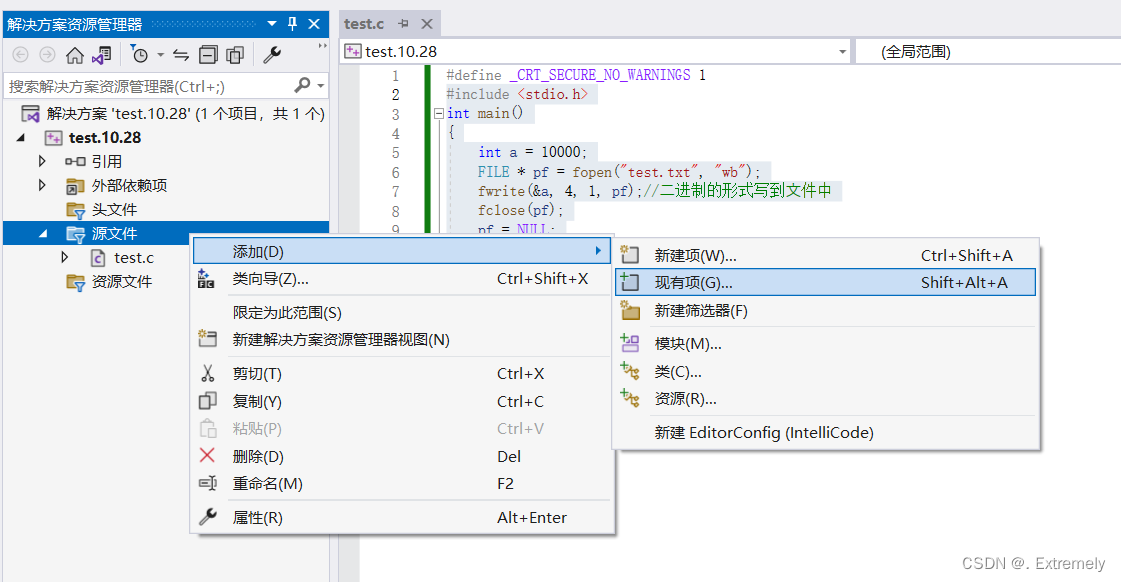 }执行代码后,我们右击源文件,添加现有项