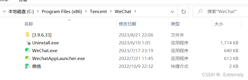 磁盘上的存储的东西就是⽂件。 但是在程序设计中,我们⼀般谈的⽂件有两种:程序⽂件、数据⽂件,分类的依据是从⽂件功能的⻆度来分类的,本篇主要带大家了解数据文件。 程序⽂件包括源程序⽂件(后缀为.c),⽬标⽂件(windows环境后缀为.obj),可执⾏程序(windows环境后缀为.exe) 大家打开磁盘可以看到,我们所运行起来的程序存储在磁盘的后缀都是.exe,不同的操作系统环境下的后缀名会有不同。例如: 这里的WeChat.exe就是可执行程序