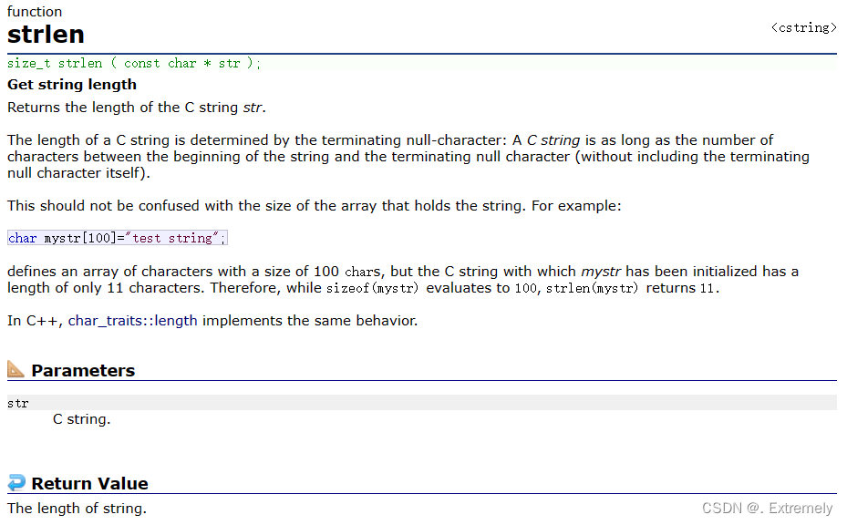 首先我们转到cplusplus中查找strlen的官方解释: 通过查找我们了解到,strlen是用来测量一个字符串长度的函数,函数的返回值就是字符的长度 字符串以 ‘\0’ 作为结束标志,strlen函数返回的是在字符串中 ‘\0’ 前⾯出现的字符个数(不包含 ‘\0’ )。
