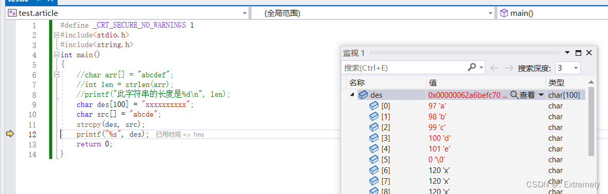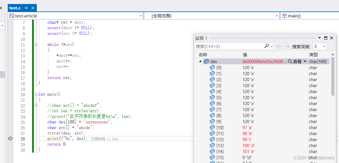 char* strcpy(char * destination, const char * source );这里我们要注意: • 源字符串必须以 ‘\0’ 结束 • 会将源字符串中的 ‘\0’ 拷⻉到⽬标空间 • ⽬标空间必须⾜够⼤,以确保能存放源字符串 • ⽬标空间必须可变 例如,我们将abcde拷贝到des中去: 我们可以打开调试窗口调试一下,就可以看到des将src中的\0也拷贝过去了