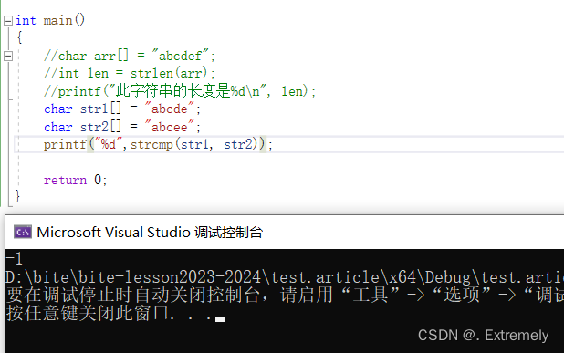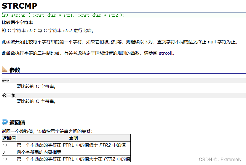}strcmp时用于比较两个字符串的,此函数开始比较每个字符串的第一个字符。如果它们彼此相等,则继续以下对,直到字符不同或达到终止 null 字符为止,如果str1大于str2(⽐较两个字符串中对应位置上字符ASCII码值的⼤⼩),返回 一个大于0的值,str1小于str2,返回 一个小于0的值,如果完全等于,就返回0
