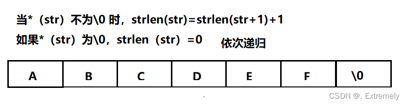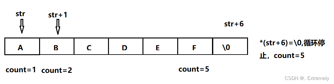 我们定义一个count,用while循环实现count的++,str为字符串的第一个元素的地址,也就是我们常说的首地址,如果解引用后(str)不是"\0",的话,count就++,也就是说元素个数+1,count++后str的位置也要往后移动,所以str++,当str=="\0"时循环停止,count就是字符串的长度了