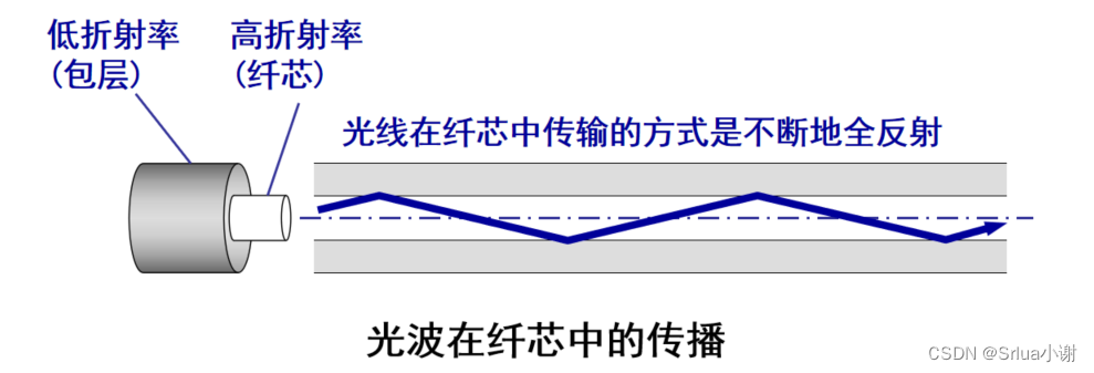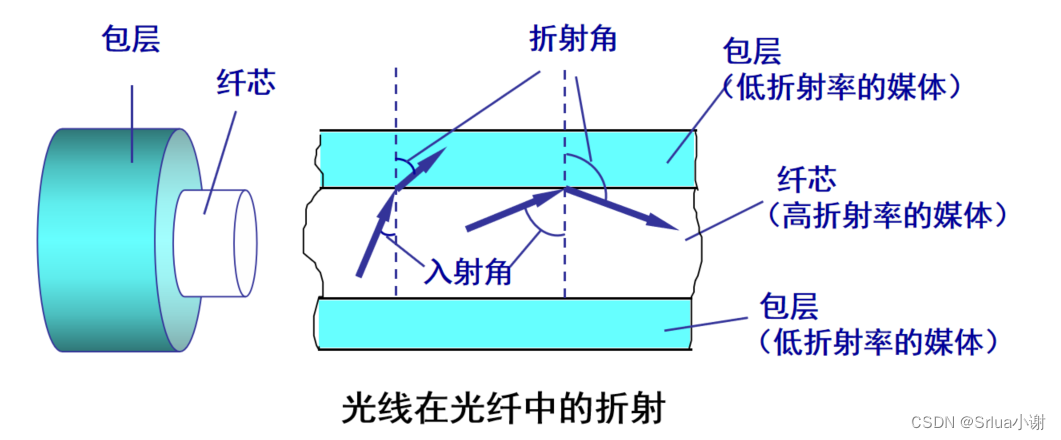 当光线从高折射率的媒体射向低折射率的媒体时,其折射角将大于入射角。因此,如果入射角足够大,就会出现全反射,光也就沿着光纤传输下去。