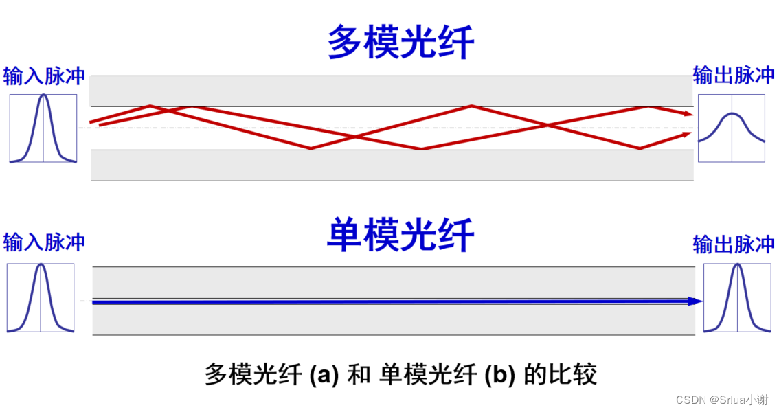 若光纤的直径减小到只有一个光的波长,则光纤就像一根波导那样,它可使光线一直向前传播,而不会产生多次反射。这样的光纤称为单模光纤。