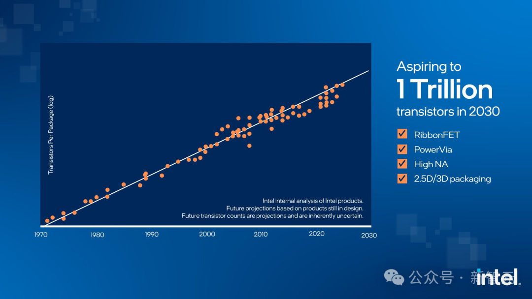 从下图我们可以看出,英特尔还在努力用各种技术和方法为自己老祖宗提出的定律续命,并表示,问题不大,你看我们还是直线没有弯。