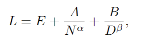 其中L是数据集上每个token的交叉熵损失,E、A、B、α和β是常数。E表示数据集的“不可减少损失”,而第二项和第三项分别代表由于模型或数据集的有限性而导致的错误。