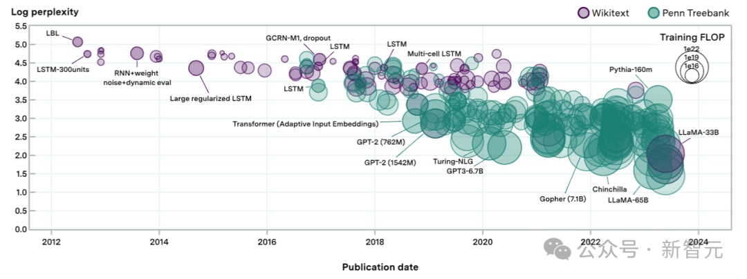 形状的大小与训练期间使用的计算成正比,困惑度评估来自于现有文献以及作者自己的评估测试。