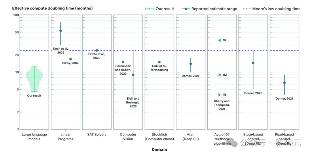 上图表示不同领域的算法改进对有效计算翻倍的估计。蓝点表示中心估计值或范围;蓝色三角形对应于不同大小(范围从1K到1B)的问题的倍增时间;紫色虚线对应于摩尔定律表示的2年倍增时间。