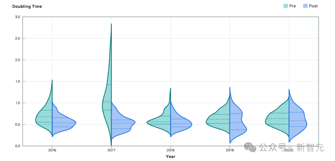 上图比较了2016年至2020年前后的算法有效计算的估计倍增时间。相对于前期,后期的倍增时间较短,表明在该截止年之后算法进步速度加快。