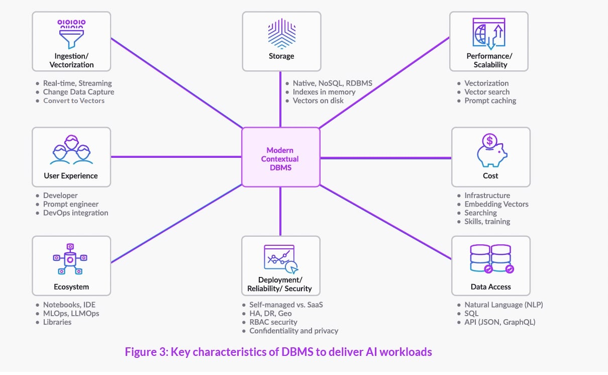 在决定如何评估新数据库或现有数据库以处理生成 AI 工作负载时,需要考虑许多因素。下图显示了交付 AI 工作负载所需的基本功能,并对其进行了更详细的解释: