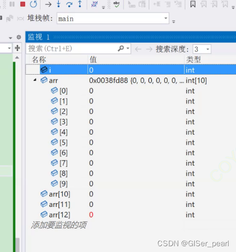 通过监视窗口,我们可以观察到arr[12]中初始化为0后,i也初始化为0。再次运行,我们就会发现,随着arr[12]的增大,i的值也在增大,那么,这是为什么呢?