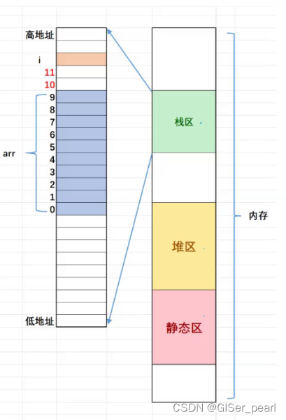 当我们&arr[12]和&i的时候,我们就会发现这两个的值一模一样。当arr[12]快要变成13的时候,arr[i]又将它初始化为0,i永远不可能变成13,这个循环永远不可能停下来,这样的现象使其永远不可能停止下来。