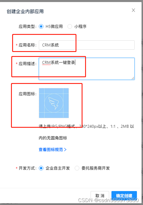输入【应用名称】,【应用描述】,上传系统图标或者不上传都可以,点击【确认创建】