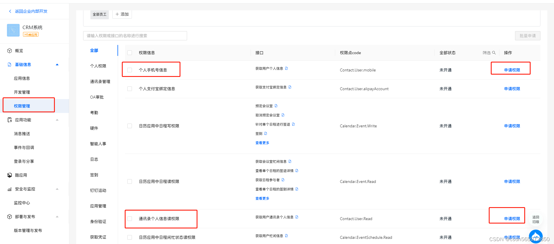 这里需要申请【个人手机号信息】、【通讯录个人信息读权限】两个权限,权限申请完成之后点击菜单【登录与分享】