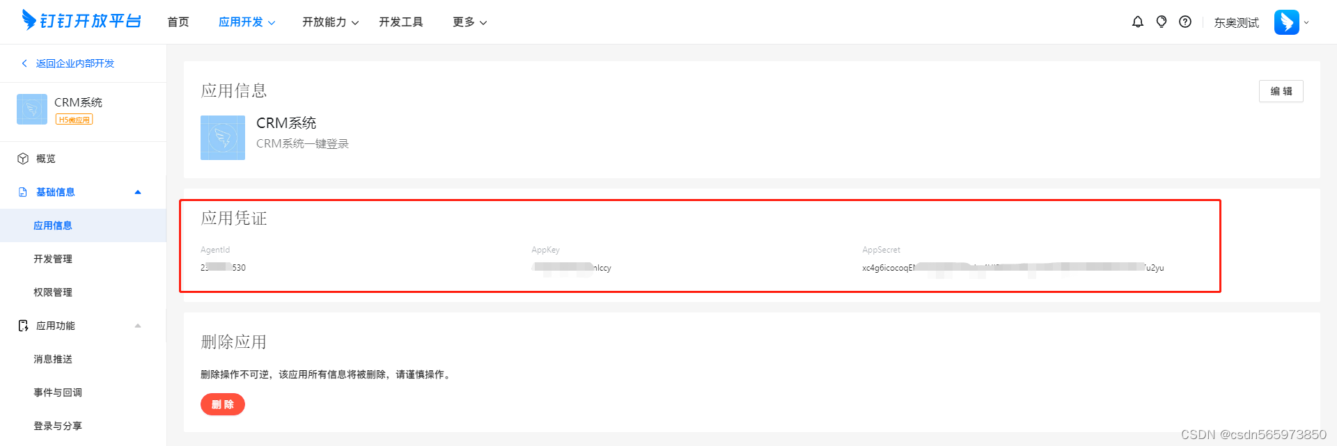 创建完成之后你就可以看到你创建的H5微应用的应用凭证,点击左侧菜单【权限管理】