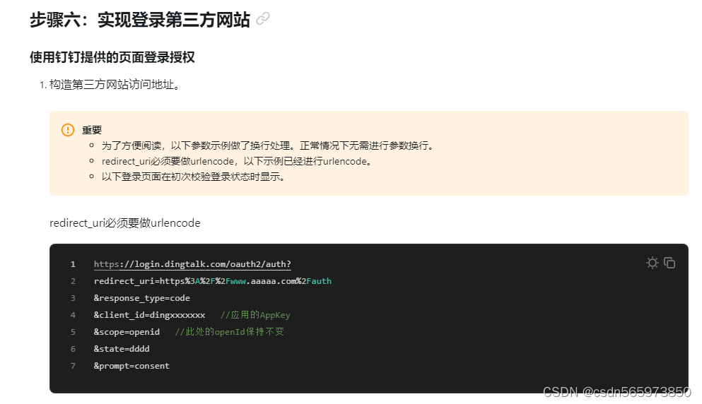 首先需要在登录页构造钉钉一键登录跳转链接,构造链接参考官方文档