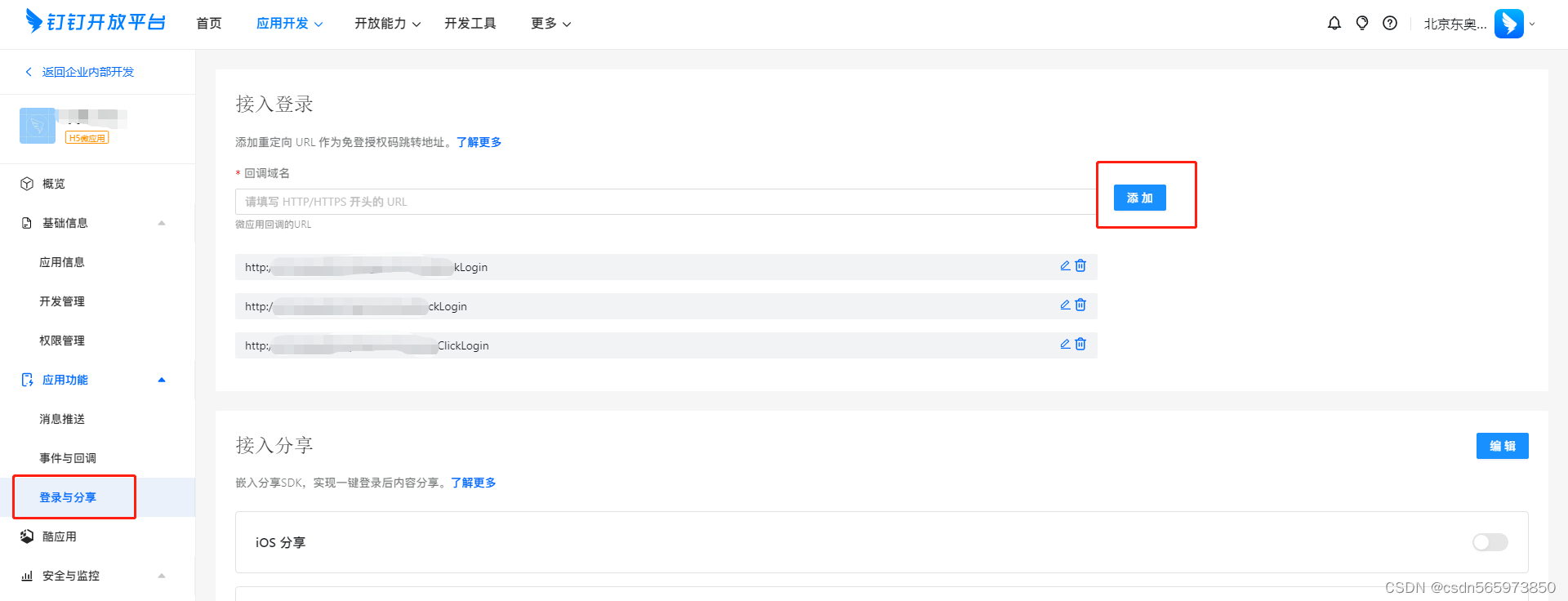 在输入框中输入回调的域名及对应的方法,点击【添加】完成回调URL的配置,这里因为是三套环境(开发、测试、线上),所以配置三套回调URL,三套环境用同一套应用凭证,当然你也可以选择创建三个H5微应用来支持三套环境。
