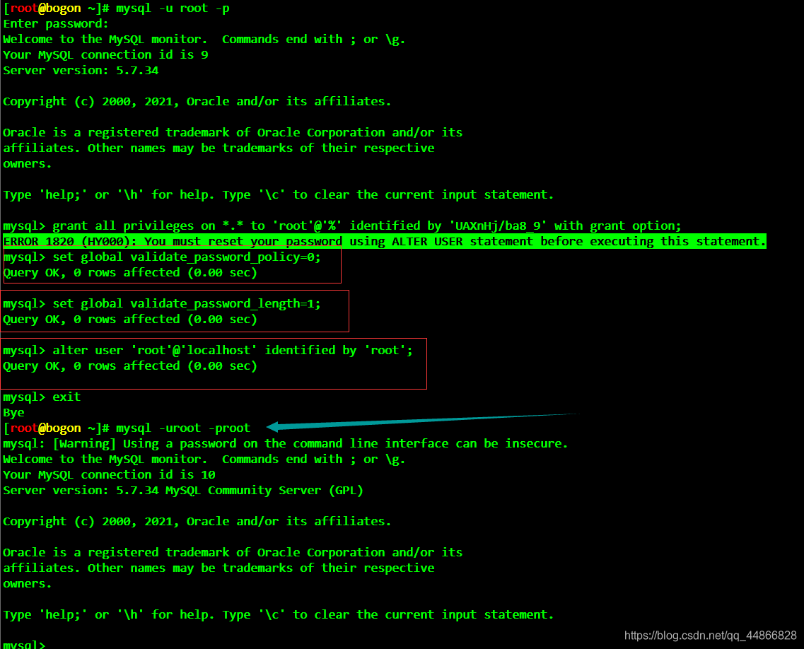 validate_password_length(密码长度)参数默认为8,我们修改为1 set global validate_password_length=1;