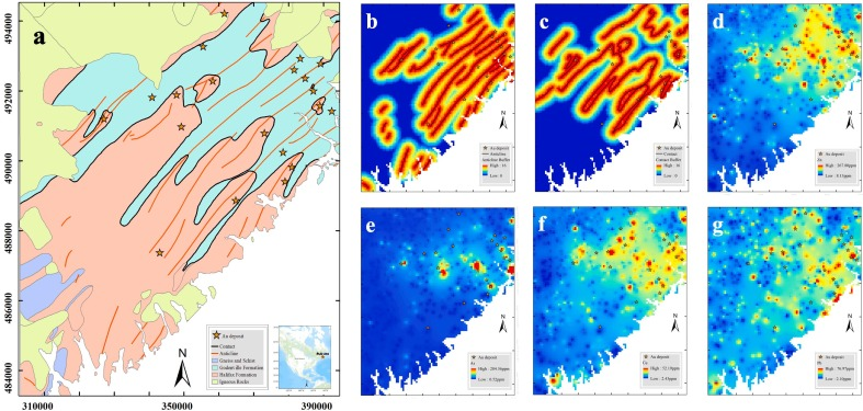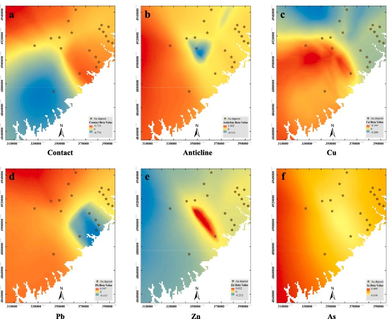 研究区域内共有 20 处浊积岩金矿床。因此,该研究使用了 6 个特征层,包括背斜构造因素,Goldenville 和 Halifax 地层之间的接触因素,以及铜 (Cu)、铅 (Pb)、砷 (As) 和锌 (Zn) 等化学元素。