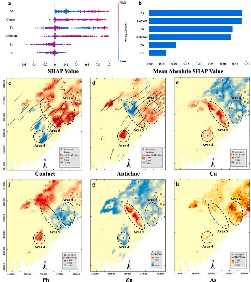 通过对不同区域不同特征的矿化影响进行评估,该研究发现「区域 4」的矿化与背斜和 Pb 强相关,「区域 5」存在两个矿藏,其中北部矿床受 Cu、Pb、Zn、As 四种元素的积极影响,表明该低区同时具有中温热液和低温热液成矿作用;南部矿床受到 Zn 和 As 的正向影响,表明其中以中温热液为主。