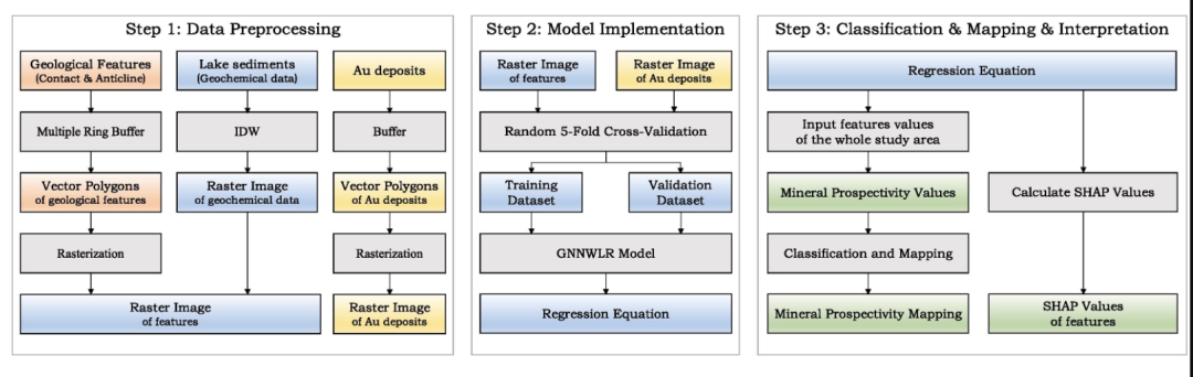 GNNWLR 集成了地理空间和神经网络,结合 Shapley 加性解释理论,不但能够大幅提升预测的准确性,并且能够在复杂的空间场景中提升矿物预测的可解释性。