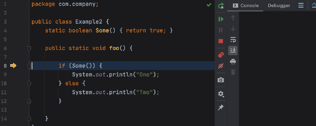 IntelliJ IDEA 在调试过程中,有多种方法可以设置目标执行行。可以使用断点,也可以使用“单步执行”(F8)、“单步执行 (F7)”和“运行到光标”(⌥F9) 命令单步执行到行。