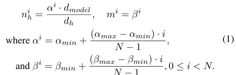 苹果引入参数 α 和 β 两个超参数来分别缩放每层注意力头的数量 n_h 和 m。对于第 i 层,n_h 和 m 计算为: