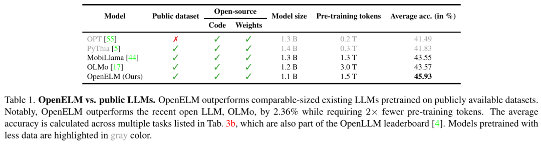 结果显示,OpenELM 的性能优于使用公开数据集进行预训练的现有开源 LLM(表 1)。例如,具有 11 亿个参数的 OpenELM 性能优于 OLMo。
