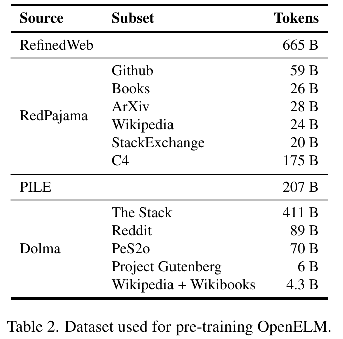 对于预训练,苹果使用公共数据集。具体来说,他们的预训练数据集包含 RefinedWeb、deduplicated PILE、RedPajama 的子集和 Dolma v1.6 的子集,总计约 1.8 万亿个 token 。如下表所示。