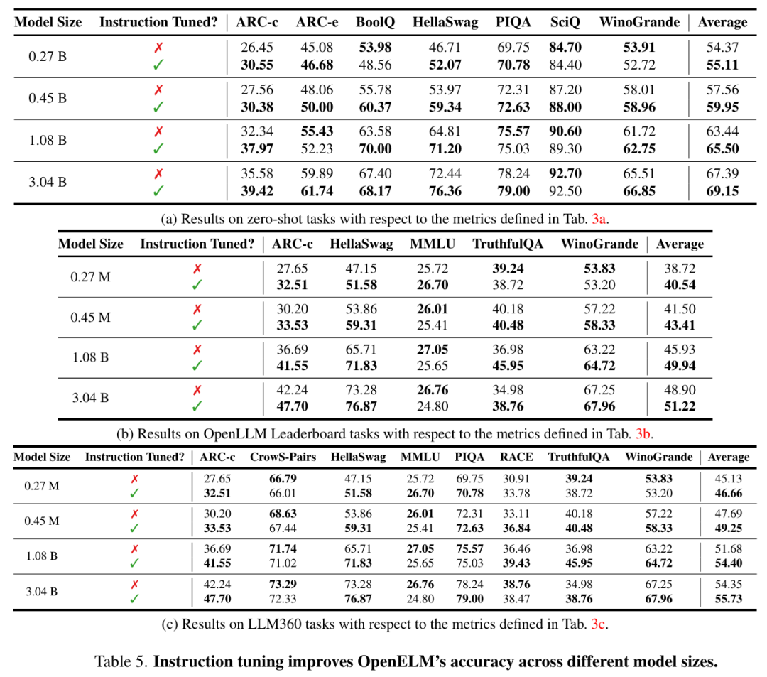 如图 5 所示,在不同的评估框架中,指令微调始终能将 OpenELM 的平均准确率提高 1-2%。