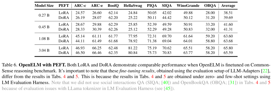 参数高效微调(PEFT)结果。研究者使用常识推理的训练和评估设置。这个设置为不同方法提供了 8 个多项选择数据集的 170k 训练样本进行 PEFT 研究,包括 LoRA 和 DoRA。研究者将 OpenELM 与这些方法整合在一起,并使用 8 个 NVIDIA H100 GPU 对所生成的模型进行了三个训练周期的微调。如表 6 所示,PEFT 方法可以应用于 OpenELM。在给定的 CommonSense 推理数据集上,LoRA 和 DoRA 的平均准确率相似。