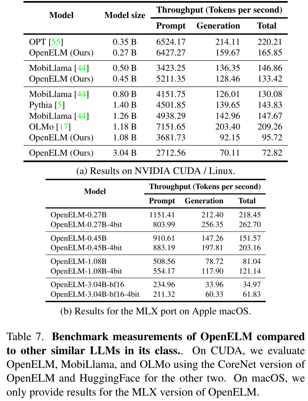 表 7a 和 7b 分别展示了本项工作在 GPU 和 MacBook Pro 上的基准测试结果。尽管 OpenELM 在相似参数数量下准确度更高,但其速度比 OLMo 慢。虽然这项研究的主要关注点是可复现性而不是推理性能,但研究者还是进行了全面的性能分析来判断工作的瓶颈所在。