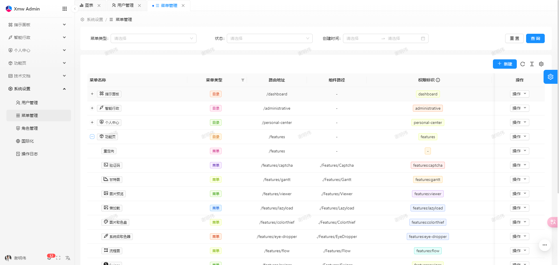 pnpm buildXmw_web/src/pages 目录下新建 文件夹/index.tsx 文件Xmw_web/config/router 文件中加入路由配置(系统只做了动态菜单,没有做动态路由,没有找到可行的办法)Xmw_web/src/utils/enums/index 文件中加入 ROUTES 枚举映射Xmw_web/src/utils/const/index 文件中加入 MenuRemixIconMap 图标映射系统管理-国际化-menu 中添加路由配置系统管理-菜单管理 中按照规则添加菜单,可打开多个标签页参考,路由配置参考:路由系统管理-角色管理 中编辑状态中勾选相应的菜单,保存刷新页面,即可看到路由菜单生效- 登录 / 注销