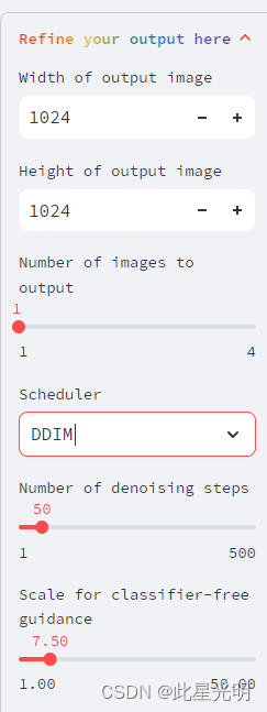 这里去噪步骤数(1-500步)、 无分类指导的分辨率(1-50)、使用 img2img/inpaint 时的提示强度(0-1 1.0 相当于完全销毁图像中的信息)、选择要使用的细化样式(省略了其他 2 种样式)和噪声的分数。
