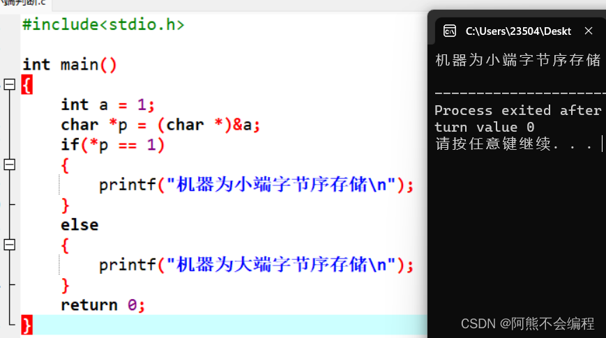 简单处理,创建一个整形变量,存值为1,16进制表示为0x00 00 00 01也为小端存储模式,而0x 01 00 00 00 为大端存储模式对这个整型变量地址进行强制类型转换成char*类型,使得转换后每次只能访问一个字节,在判断类型转换后解引用的值是否为一,如果小端存储,低地址放低字节那访问一个字节就是01,而如果是大端字节存储,低地址放高字节,访问一个字节,值就为0。
