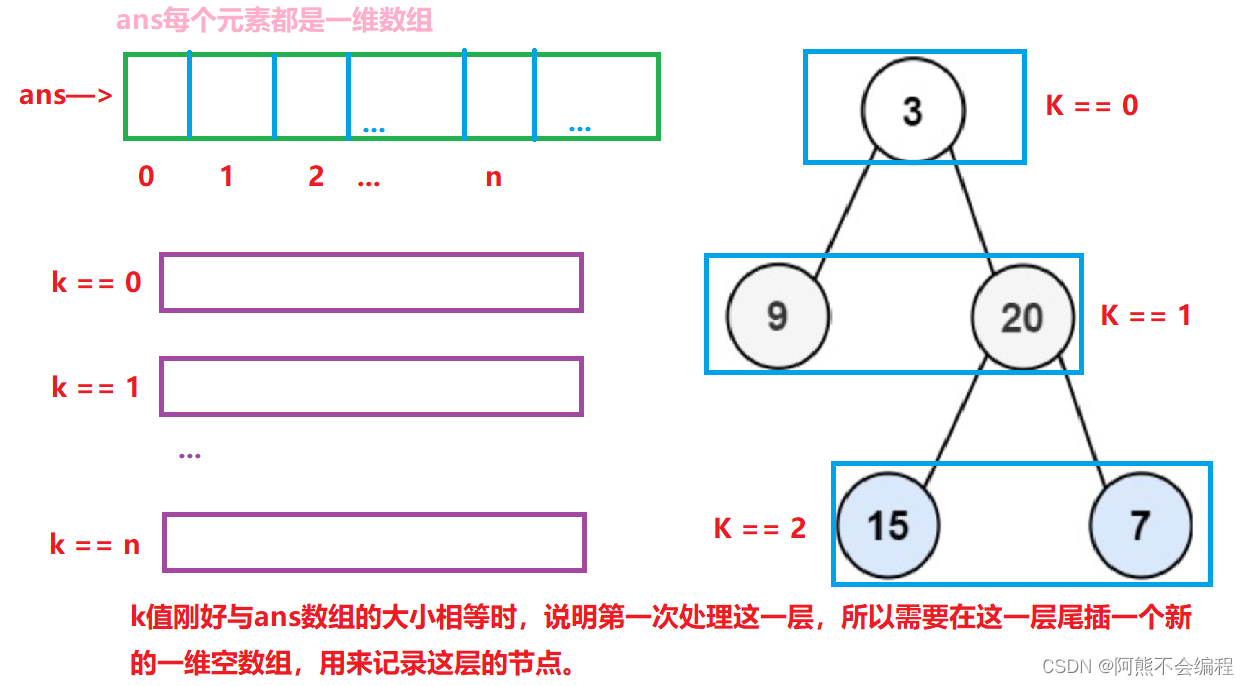 我们再来回顾一下昨天说的二叉树层序遍历深搜的过程。 1、深搜需要传入参数root, 从哪层开始处理的层数,二维数组ans,在dfs中,首先判断当前节点是否为空,如果为空就return; 2、不过当前节点不为空,接下来就判断当前层数是否是最新遍历到的层数,如果是,在本层数组里压入元素之前需要创建一个空一维数组尾插到二维数组ans中。 3、接下来就是将当前处理节点压入到对应层数的一维数组中,这个节点处理完毕,深搜就要开始递归处理,先向左子孩子处理,下一层为本层节点+1,所以传参层数为k + 1,同理右子树也是如此,最后返回即可。 &emsp:4、深搜完成之后,我们就得到了一个自顶向下的层序遍历结果,我们想让结果自底向上遍历,只需ans的一维数组进行首尾交换,最后返回即可。