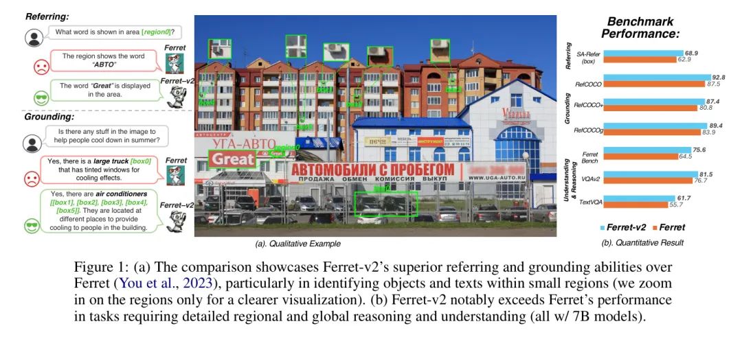 虽然Ferret无缝地将区域理解整合到大型语言模型(LLM)中,以增强其参照和定位能力,但它存在一定的局限性:受到预训练的固定视觉编码器的限制,并且在更广泛的任务上表现不佳。在这项工作中,作者揭开了Ferret-v2的面纱,这是对Ferret的重要升级,具有三个关键设计。